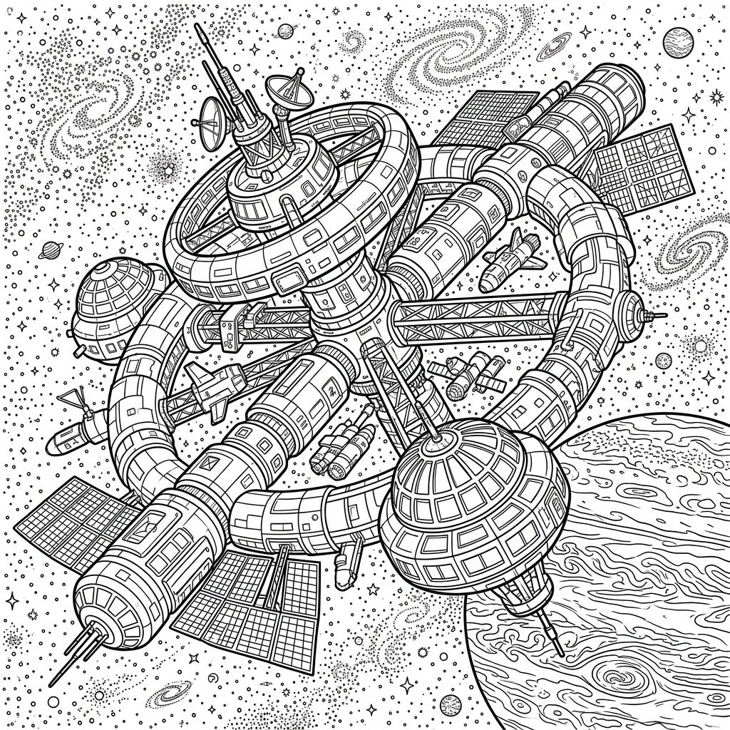 Embark on an interstellar journey with this intricate Planetary Orbital Station coloring page. Discover a futuristic space station orbiting a majestic gas giant, surrounded by a universe of stars and galaxies, ready for your creative touch.
