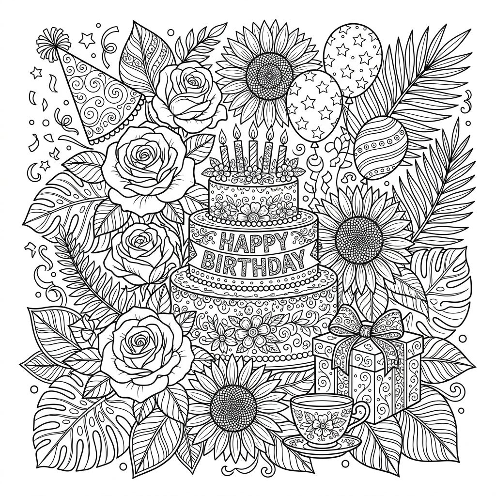 Unwind and celebrate with this beautifully intricate adult coloring page, blending lush botanical elements like roses and sunflowers with festive birthday cheer. Discover a world of detailed patterns waiting for your creative touch to bring this special occasion to life.