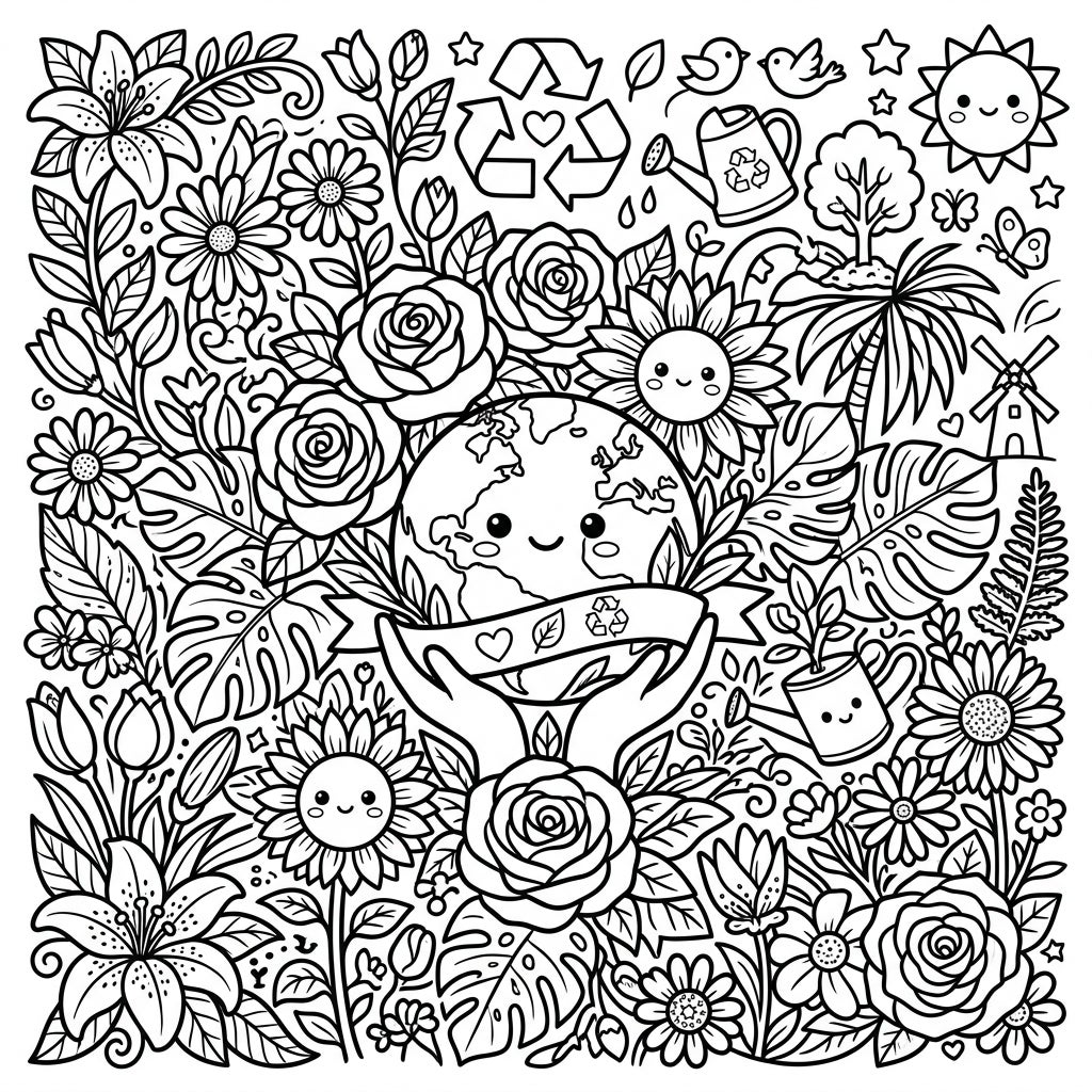 Immerse yourself in a delightful Kawaii-style coloring experience celebrating Earth Day, filled with charming plants, flowers, and eco-friendly symbols. This intricate page offers a joyful way to express your love for nature and sustainability through art.