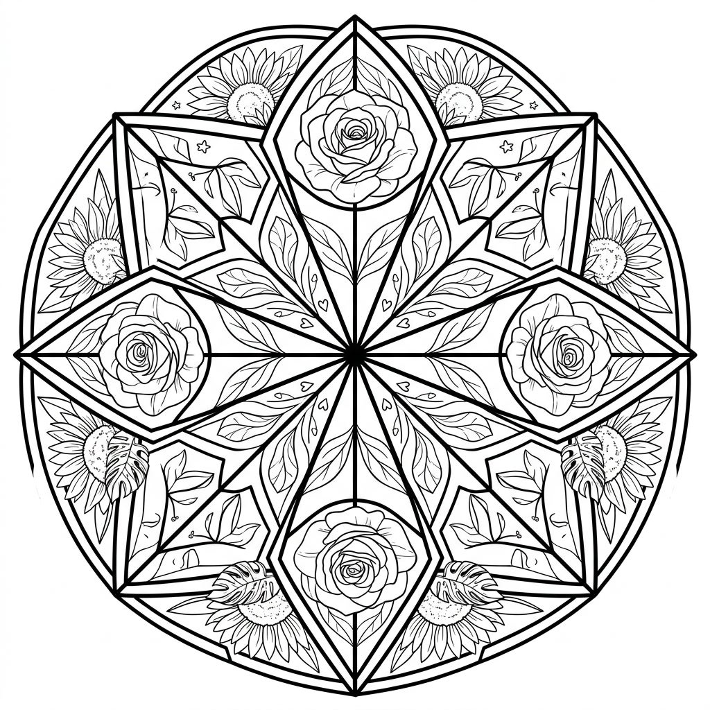 This captivating coloring page presents a beautiful floral mandala, meticulously crafted in the striking stained glass style. Bold, thick lines segment the circular design, creating distinct panes that frame an array of botanical wonders. You'll discover elegantly blooming roses, vibrant sunflowers, and exotic tropical leaves, all arranged with perfect radial symmetry, inviting you to bring them to life with a kaleidoscope of colors.