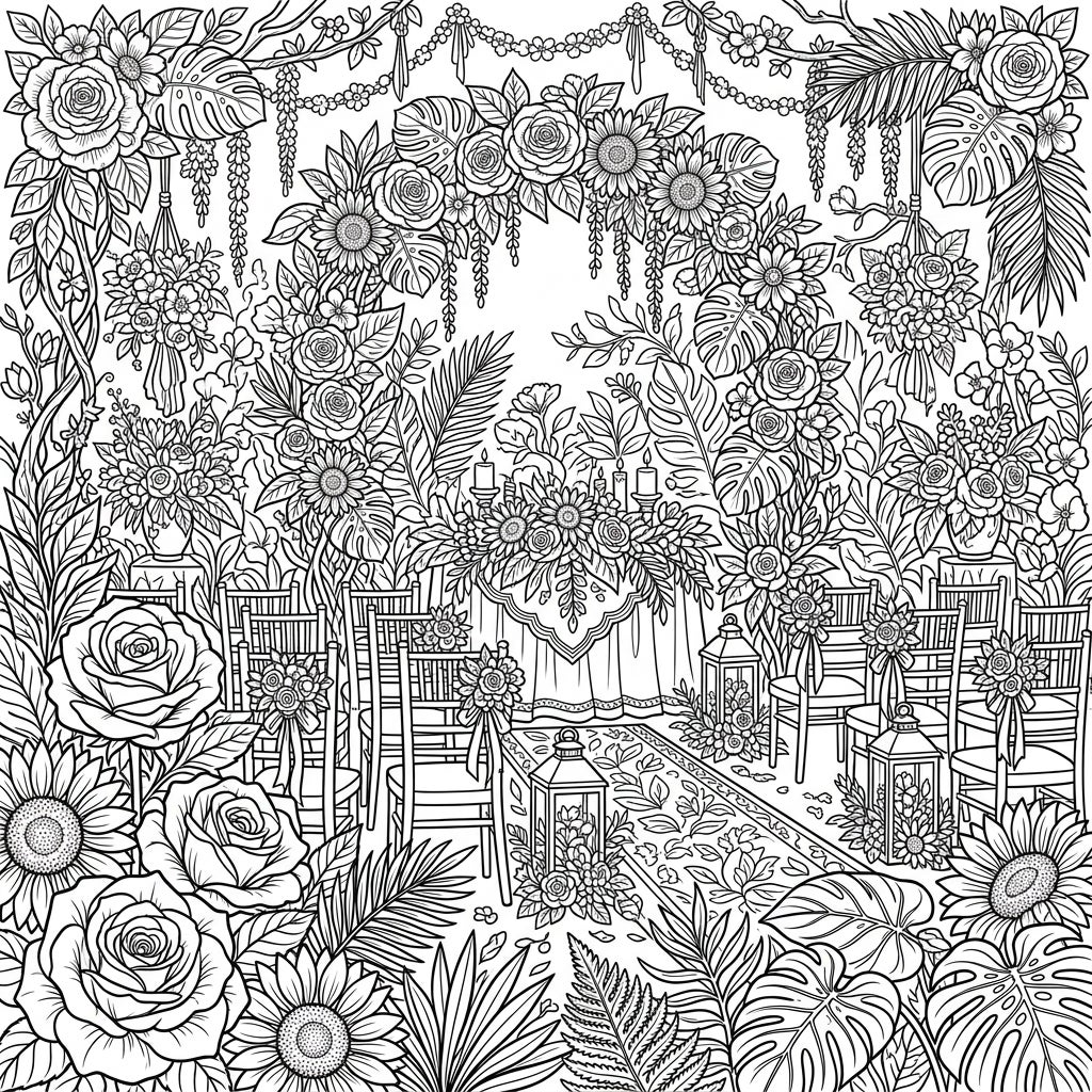 Step into a breathtaking botanical wedding scene, meticulously designed for your coloring pleasure. This full-scene illustration features a magnificent arch adorned with blooming roses, cheerful sunflowers, and lush tropical leaves like monsteras and ferns. Every corner of the page is filled with exquisite details, from the delicate veins of petals to the intricate patterns on the lanterns and aisle runner, ensuring a truly immersive experience.