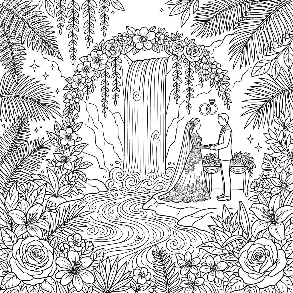 Immerse yourself in a beautiful celebration of love with this exquisite coloring page. A charming bride and groom stand before a dramatic plunge waterfall, surrounded by intricate floral details, perfect for a relaxing and romantic coloring session.