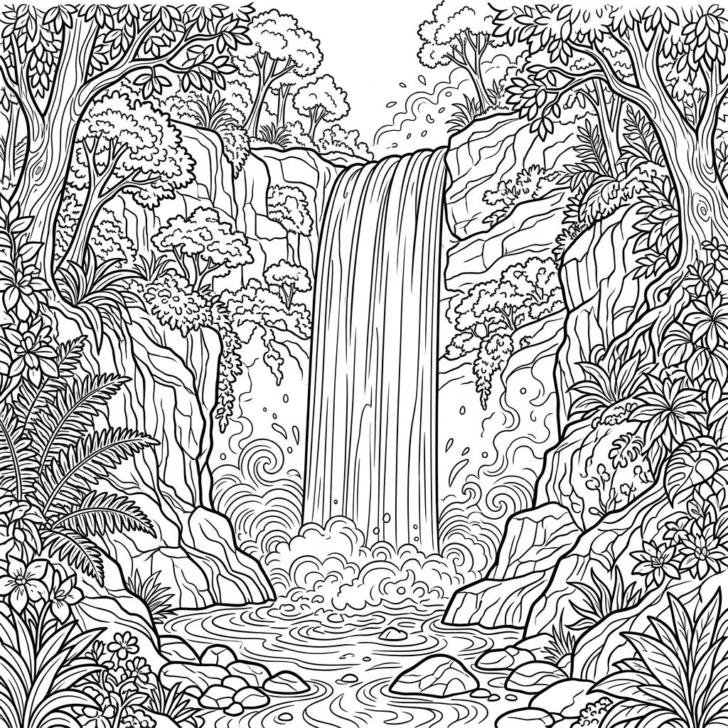 This captivating coloring page brings to life the raw power and serene beauty of a plunge waterfall. The illustration showcases water dramatically free-falling from a great height, creating a spectacular sheet of liquid before crashing into the pool below. Surrounding this natural marvel, intricate details abound: ancient trees with gnarled roots cling to the rocky cliffs, while a rich variety of ferns, flowering plants, and dense foliage frame the scene, inviting you to explore every corner with your coloring tools.