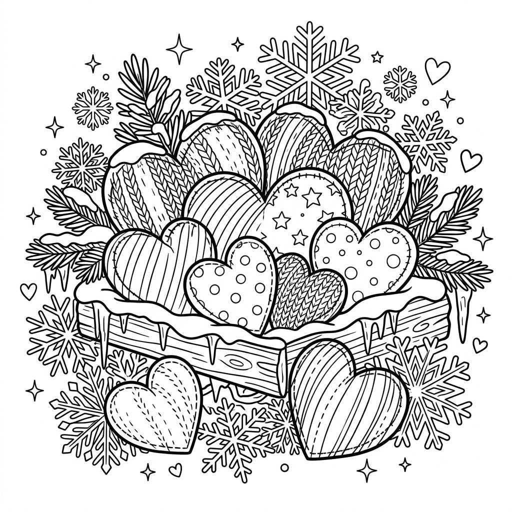 This delightful coloring page invites you into a charming winter tableau featuring an abundance of plush, heart-shaped toys. Each heart boasts unique patterns, from intricate knitted textures and classic stripes to playful polka dots and twinkling stars, all lovingly arranged within a rustic, snow-dusted wooden box. Delicate icicles drip from the edges, while fluffy snow blankets the scene, creating a sense of tranquil beauty and warmth.