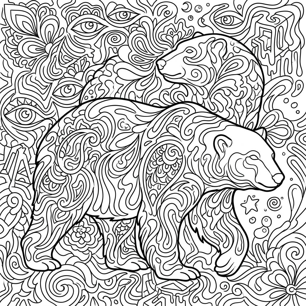Prepare to be captivated by this extraordinary coloring page, where two majestic polar bears become canvases for a psychedelic spectacle. Each bear is meticulously crafted with intricate, flowing lines that twist and turn into mesmerizing organic patterns, transforming their fur into a vibrant tapestry of artistic expression. The background is equally enchanting, a swirling vortex of abstract shapes, stylized eyes peeking from unexpected places, tiny stars, and complex designs that fill every inch of the canvas, promising an immersive coloring adventure.