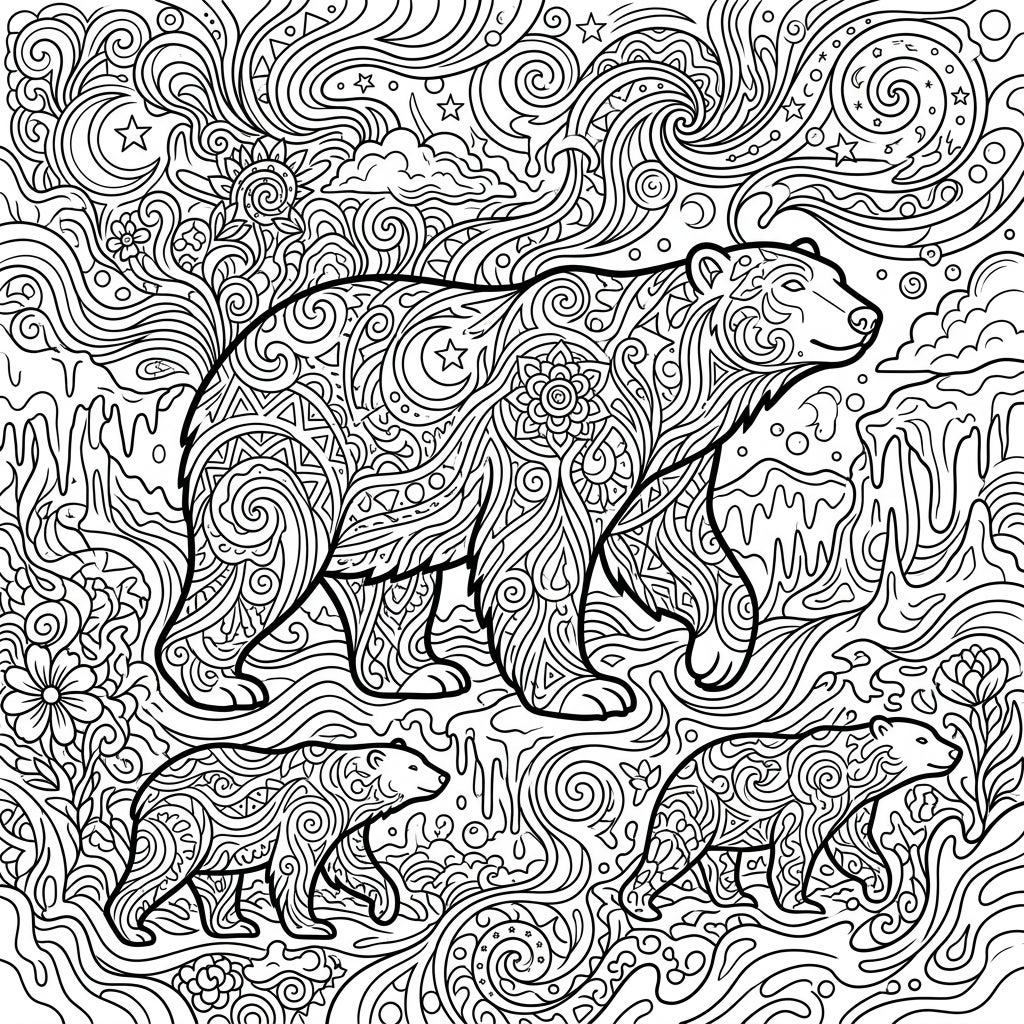 Step into a breathtaking and intricate world with this unique psychedelic polar bear coloring page. Dominated by a majestic adult polar bear, adorned with mesmerizing patterns, it is accompanied by two playful cubs, also intricately detailed. The entire scene is a tapestry of swirling lines, organic forms, stars, moons, and abstract floral elements, creating a captivating full-page design.
