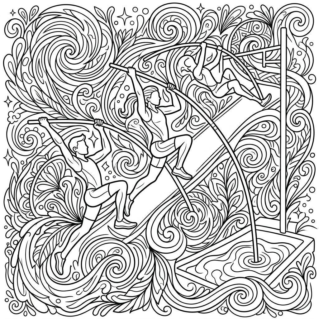 Bring this vivid scene to life with your favorite colors! Experiment with bold, contrasting hues and gradients to enhance the psychedelic mood, making the swirling background pop with vibrant energy. Consider using cooler tones for the athletes to make them stand out, or integrate warm, fiery shades to match the intensity of their performance. Let your artistic spirit soar as high as the vaulters themselves, creating a masterpiece that truly reflects your creative vision.