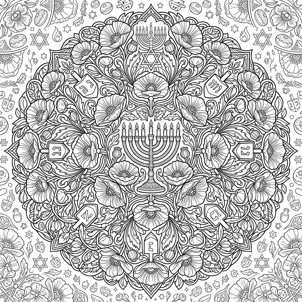 Unleash your creativity with this exquisite coloring page combining the beauty of poppy mandalas with the joyous spirit of Hanukkah. Featuring intricate designs of menorahs, dreidels, and blooming poppies, it's perfect for a relaxing and meaningful coloring experience.