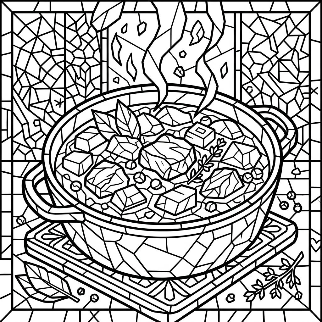 Dive into a unique culinary coloring experience with our Pork Stew Stained Glass coloring page. This intricate design blends the comforting essence of a savory meal with the captivating beauty of classic stained-glass art.