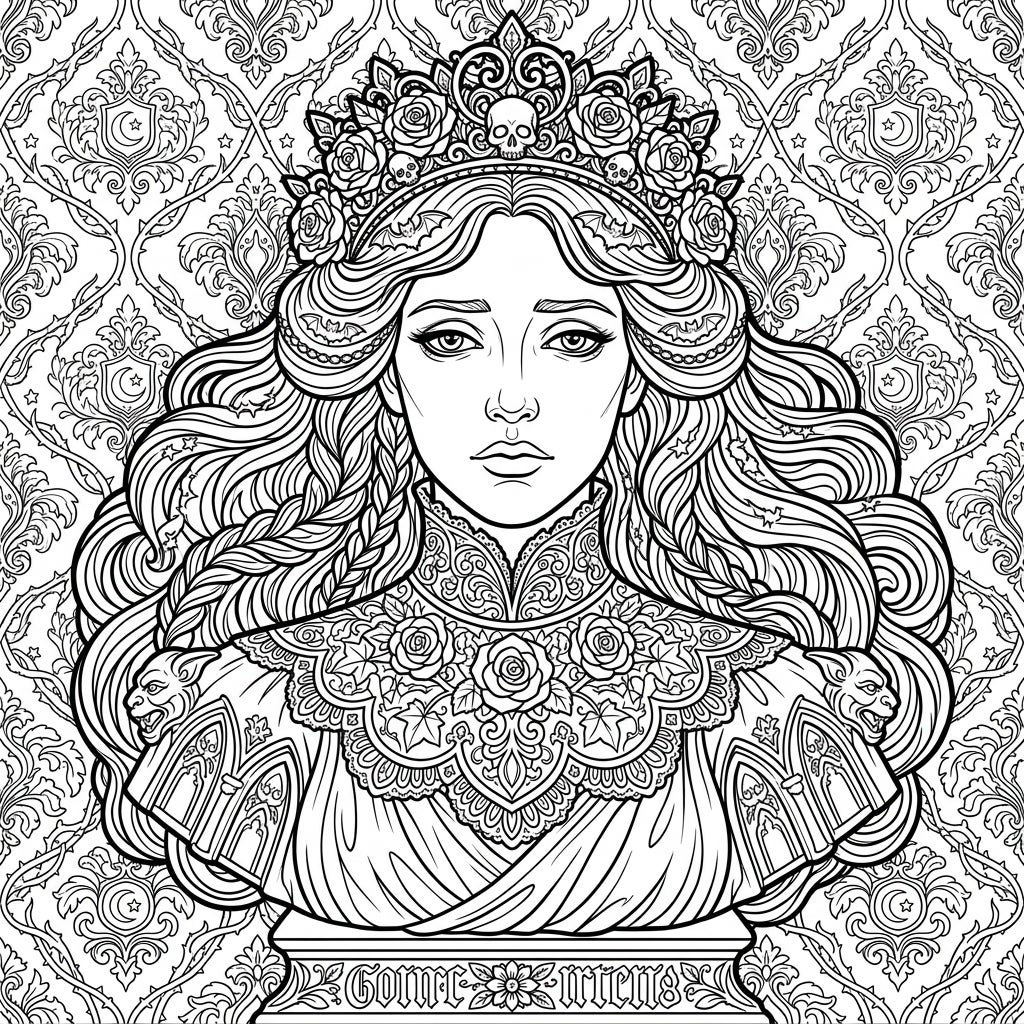 Step into a realm of ornate beauty with this exquisite Gothic Queen portrait sculpture coloring page. This intricate design showcases a regal bust, crowned with a majestic tiara featuring delicate roses, macabre skulls, and subtle bat motifs, all resting upon her flowing, elaborately braided hair. Her elegant high-collared gown is adorned with detailed roses and fine lace-like patterns, while the sculpted base incorporates striking gothic architectural accents and ferocious gargoyle-inspired figures. Look closely for the 'GOTHIC QUEENS' inscription at the pedestal's front, adding to its mysterious allure.