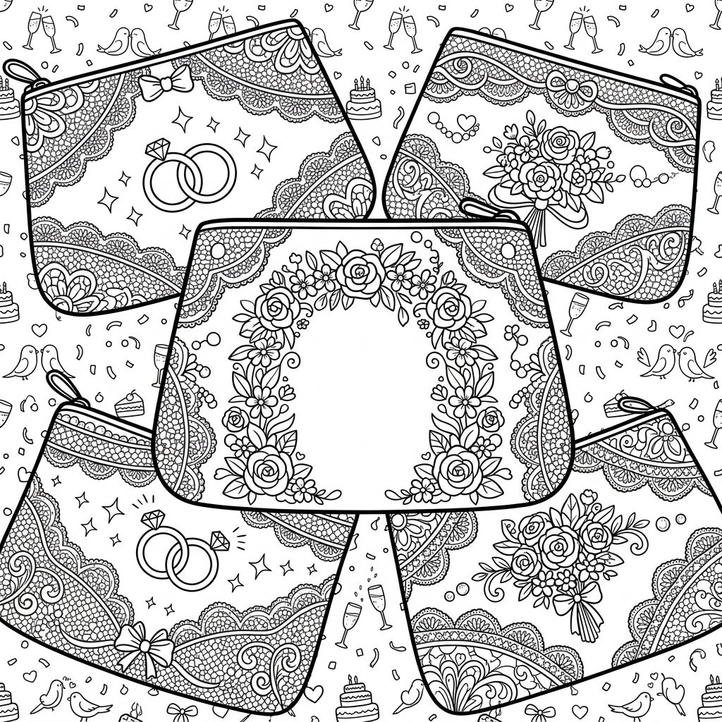 Discover an exquisite collection of pouch bags elegantly detailed with wedding celebration elements like delicate lace, sparkling rings, and beautiful floral bouquets. This intricate design invites you to infuse vibrant colors into a scene brimming with romance and joy.