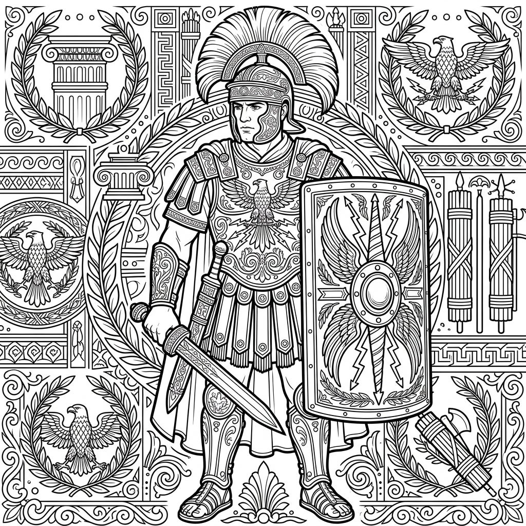 Bring this historical masterpiece to vibrant life by choosing colors that reflect the opulence of Roman military attire. Experiment with metallic shades for the armor and shield, deep reds for capes or plumes, and various greens for the laurel wreaths. The intricate background patterns provide ample opportunity for creative expression, from subtle shading to bold contrasting hues. Unleash your artistic vision and enjoy the meditative pleasure of transforming this black-and-white scene into a vivid historical tableau.