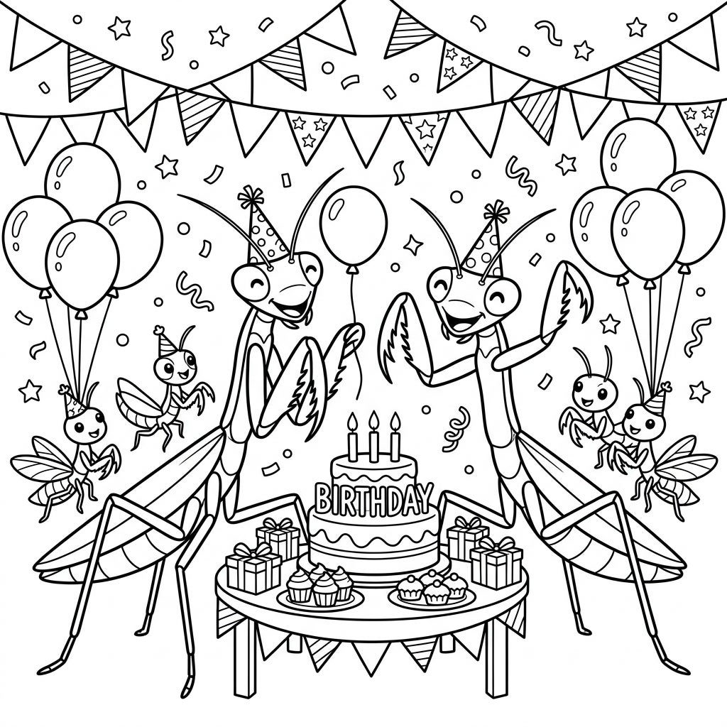 Celebrate a unique birthday with our Praying Mantis Birthday Party coloring page! Adorable mantises don party hats and gather around a cake, ready for your creative touch.