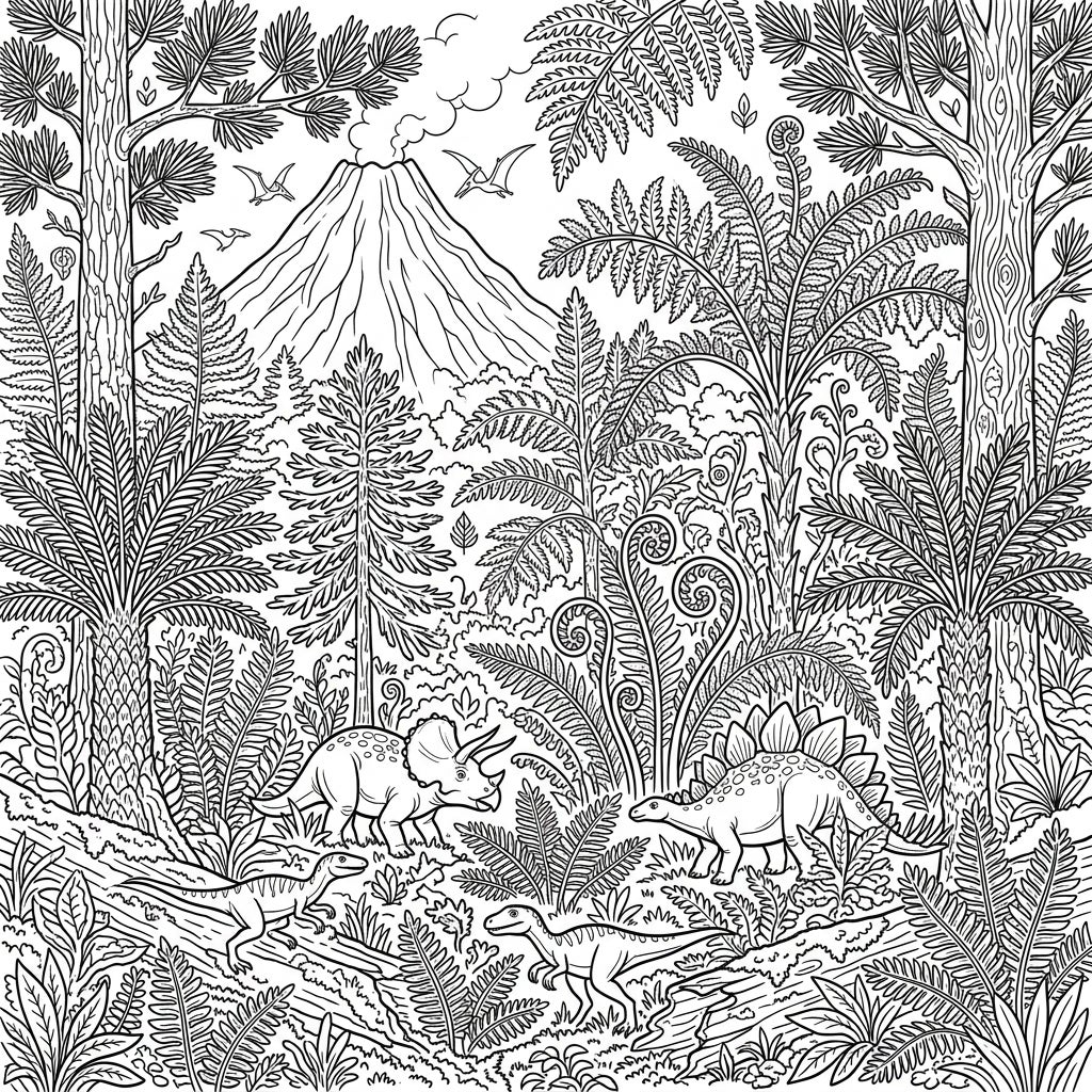 Dive into a richly detailed black-and-white illustration of a primeval world with this captivating adult coloring page. This intricate design captures the essence of a dense prehistoric jungle, teeming with ancient life. Majestic ferns, towering palm-like cycads, and coniferous trees fill every corner, creating a truly immersive landscape. In the distance, a smoking volcano hints at the raw power of the past, while three pterodactyls soar gracefully overhead.