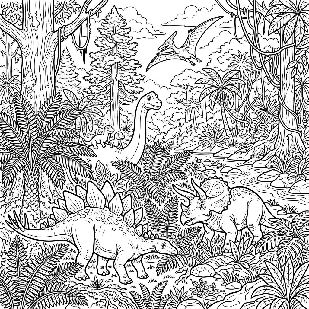 Step into a primeval landscape with this intricately designed coloring template that brings the dinosaur era to life. This scene is richly populated, showcasing a majestic Stegosaurus in the foreground with its distinctive plates, while a powerful Triceratops stands nearby, ready for your artistic touch. In the background, a gentle Brachiosaurus with two adorable baby dinosaurs on its back surveys the dense foliage, and a Pteranodon soars gracefully through the cloudy sky. Every corner of the page is filled with ancient ferns, towering conifers, gnarled trees with hanging vines, and a winding stream, providing a full and immersive coloring experience.