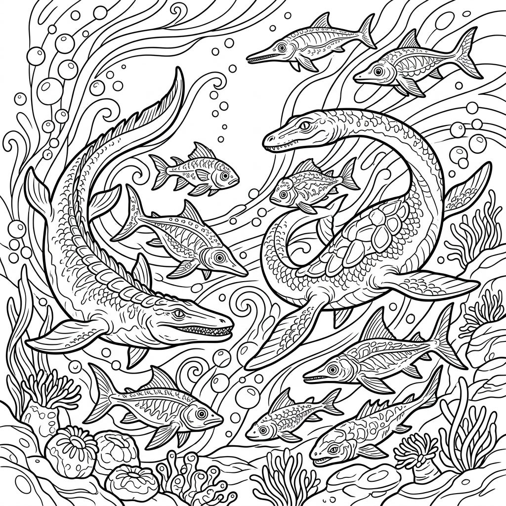 This illustration perfectly captures the awe-inspiring mystery of a forgotten aquatic world, reimagining these prehistoric giants as contemporary sea monsters. The background is richly textured with stylized waves, shimmering bubbles ascending from the depths, and a vibrant array of underwater flora like seaweed and coral, all designed to enhance your coloring experience. It’s an invitation to imagine what colors might have adorned these incredible creatures millions of years ago, transforming this page into your own vibrant vision of the deep.