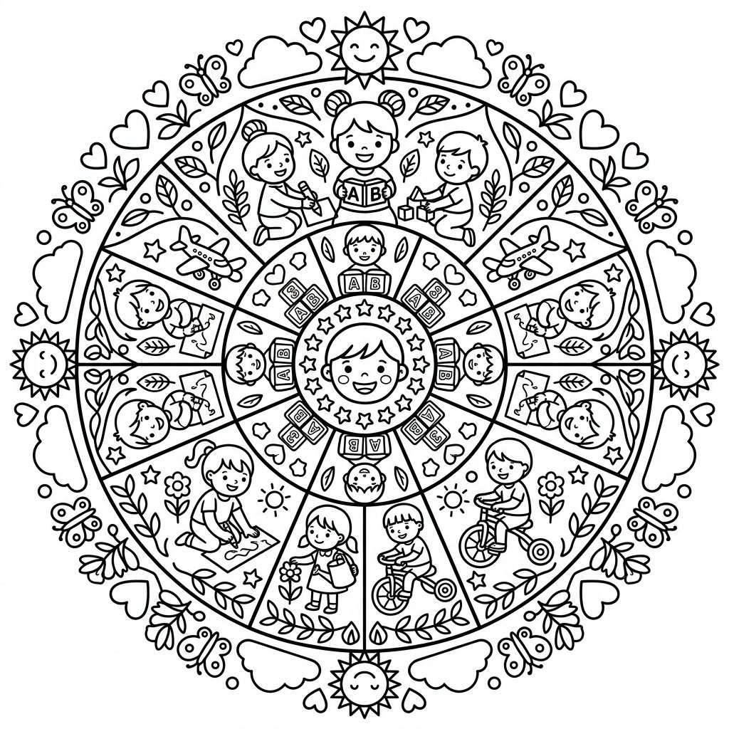 Our beautifully designed Preschoolers Mandala coloring page invites young artists into a delightful world of childhood discovery. This intricate circular pattern features a central happy child's face, radiating outwards to segments where adorable preschoolers engage in a variety of activities – from building with ABC blocks and drawing, to riding bicycles and tending to flowers. Each segment is bordered by playful elements like cheerful suns, fluffy clouds, whimsical butterflies, and hearts, all forming a perfectly symmetrical and engaging composition.