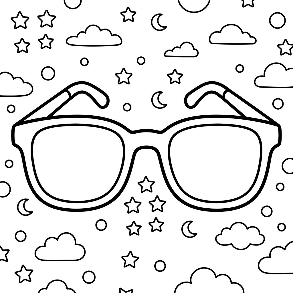Beyond just a fun activity, this page can be a gentle way to introduce children to the concept of eyewear or simply to celebrate unique accessories. The playful background, adorned with cheerful stars, whimsical crescent moons, fluffy clouds, and scattered circles, creates a dreamy atmosphere, encouraging kids to explore different color combinations and patterns. It’s an ideal activity for a quiet afternoon or a creative learning session.
