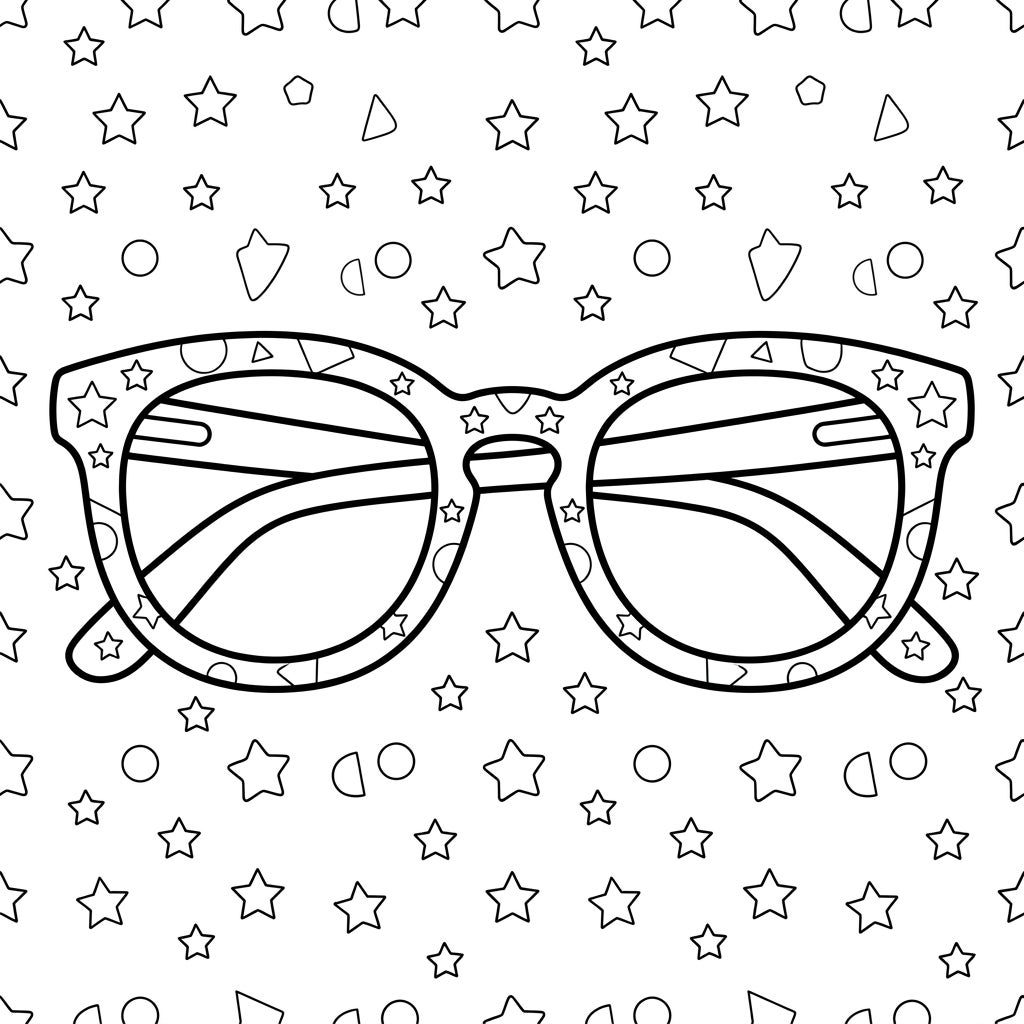 Encourage your child to experiment with a rainbow of colors for the frames – maybe bright pink, cool blue, or even a dazzling multi-color design! The background, filled with playful stars and geometric shapes, offers endless possibilities for creative expression. Use crayons, markers, or colored pencils to bring this fashionable accessory to life, making each pair of glasses truly unique and spectacular.