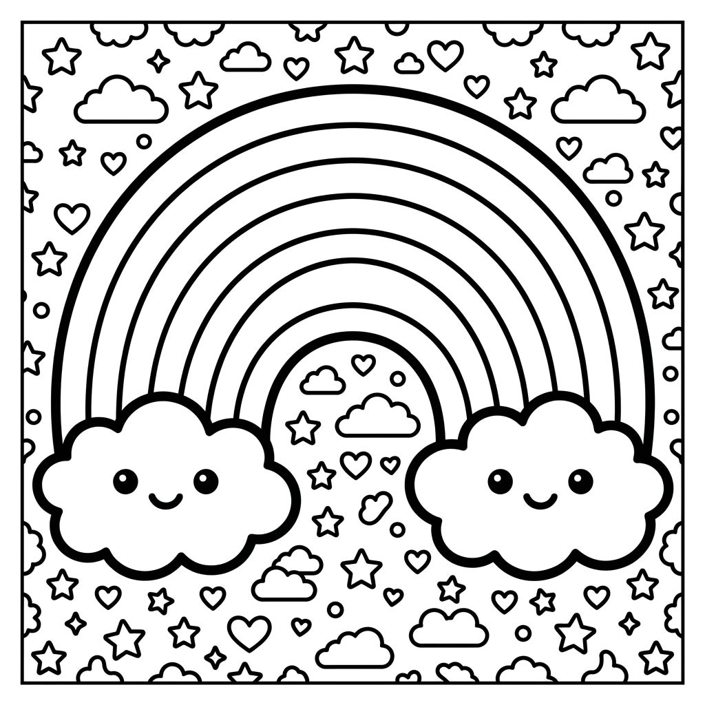 Unleash your inner artist with this enchanting Kawaii Primary Rainbow coloring page, a delightful blend of cheerful design and classic beauty. The centerpiece is a grand primary rainbow arc, boldly outlined and ready for your most vibrant color choices. Below, two irresistibly cute clouds with sweet, smiling faces offer a touch of whimsy, while the entire background is adorned with an array of charming stars, hearts, and smaller puffy clouds, all rendered in the signature adorable Kawaii style with thick, clean lines and inviting shapes.