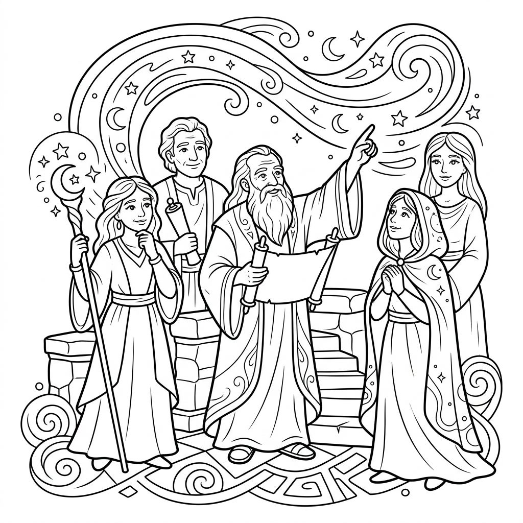 Unleash creativity with this enchanting coloring page featuring wise prophets and oracles under a celestial sky. Designed for kids aged 4-8, it offers an engaging and educational art experience.