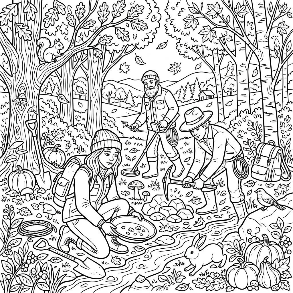 Embark on a vibrant autumn adventure with this richly detailed coloring page, capturing the excitement of prospecting in a breathtaking fall forest. Discover a trio of determined treasure hunters: a woman expertly panning for gold in a winding stream, a man meticulously sweeping a metal detector through the leaf-strewn ground, and another delving into rocks with a pickaxe. The scene is alive with the spirit of discovery, surrounded by the natural beauty of the season.