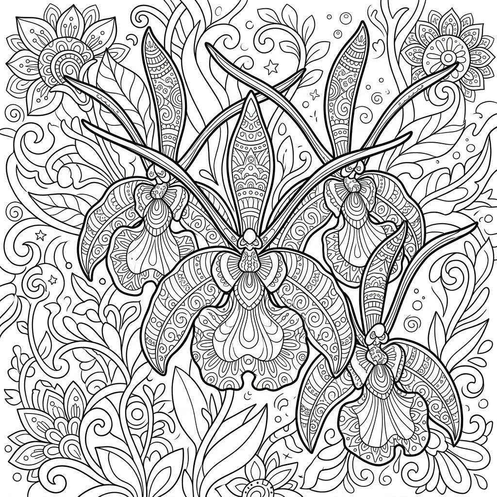 Embark on a captivating artistic journey with this exquisitely detailed Psychopsis Orchid coloring page. Renowned as 'Butterfly Orchids' for their unique, moth-like appearance and long, delicate 'antennae,' these three magnificent blooms dominate the foreground, each petal adorned with a wealth of intricate patterns, swirls, and fine lines. The background is a lush tapestry of stylized botanical elements, including graceful leaves, swirling vines, and smaller, complementary floral motifs, creating a rich and immersive canvas for your artistic expression.