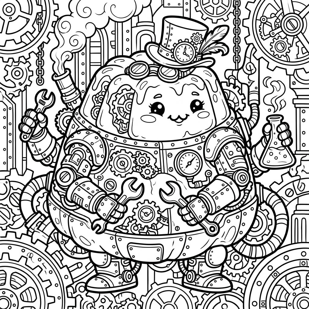 Immerse yourself in the imaginative fusion of the cute and the industrial. This coloring page captures the adventurous spirit of Steampunk, where science fantasy reigns supreme, blended with the playful charm of a pudding monster. It evokes a sense of curious discovery and inventive wonder, inviting you to explore a world powered by steam and creativity. The intricate details of gears and machinery, combined with the monster's endearing expression, create a delightful balance between robust engineering and lighthearted fun, making it an engaging challenge for colorists of all levels.