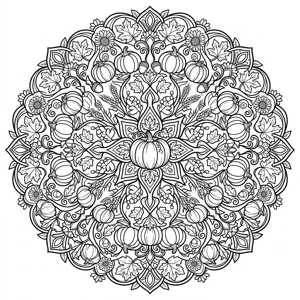 Transport yourself to a crisp autumn day at a vibrant pumpkin patch without leaving your home. This mandala captures the cozy and festive mood of fall, inviting you to slow down and immerse yourself in a creative escape. Coloring this page offers a wonderful opportunity for mindfulness and stress relief, allowing you to explore a spectrum of warm hues and earthy tones to bring this seasonal masterpiece to life.