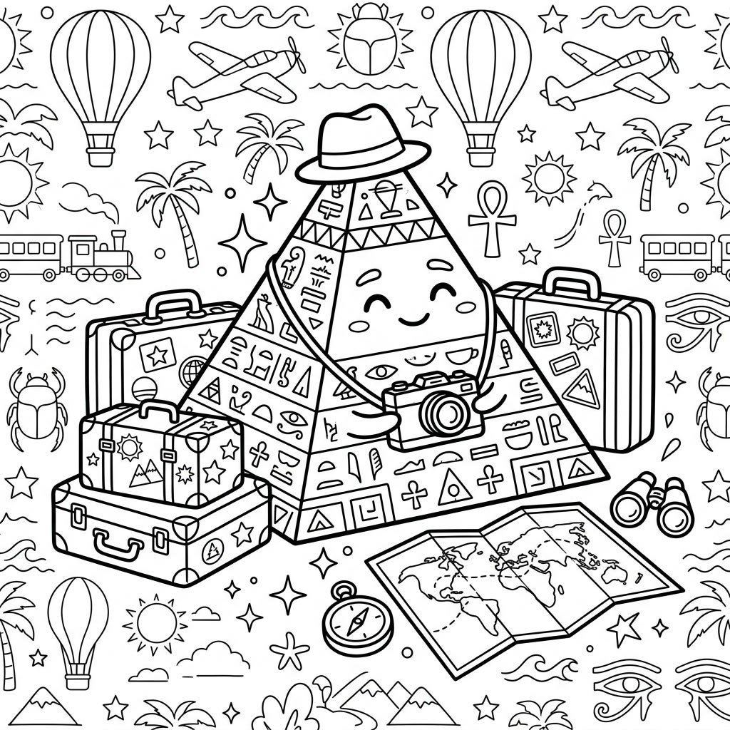 Get ready for an exciting journey with our adorable pyramidion, all set for a fantastic vacation! This unique coloring page combines ancient mystique with the joy of travel, perfect for any adventurer.