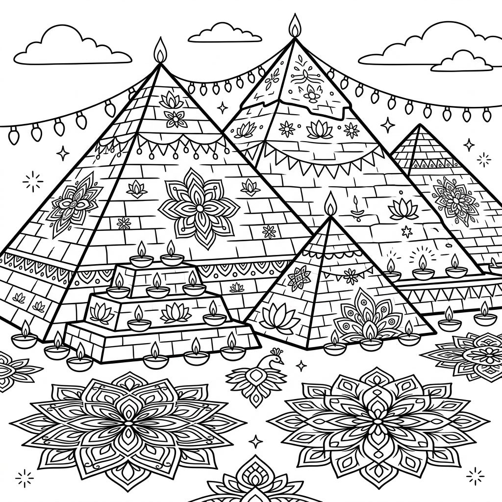 Immerse yourself in a spectacular fusion of ancient wonder and festive joy with this unique coloring page. Majestic pyramids stand adorned with elaborate decorations, including strings of delicate lights and celebratory banners. At their base and on tiered platforms, numerous traditional diyas (oil lamps) glow, alongside intricate lotus flowers and starbursts, creating a scene rich with cultural symbolism and visual interest. Large, detailed mandala-like floral patterns gracefully fill the foreground, inviting careful attention to every stroke.