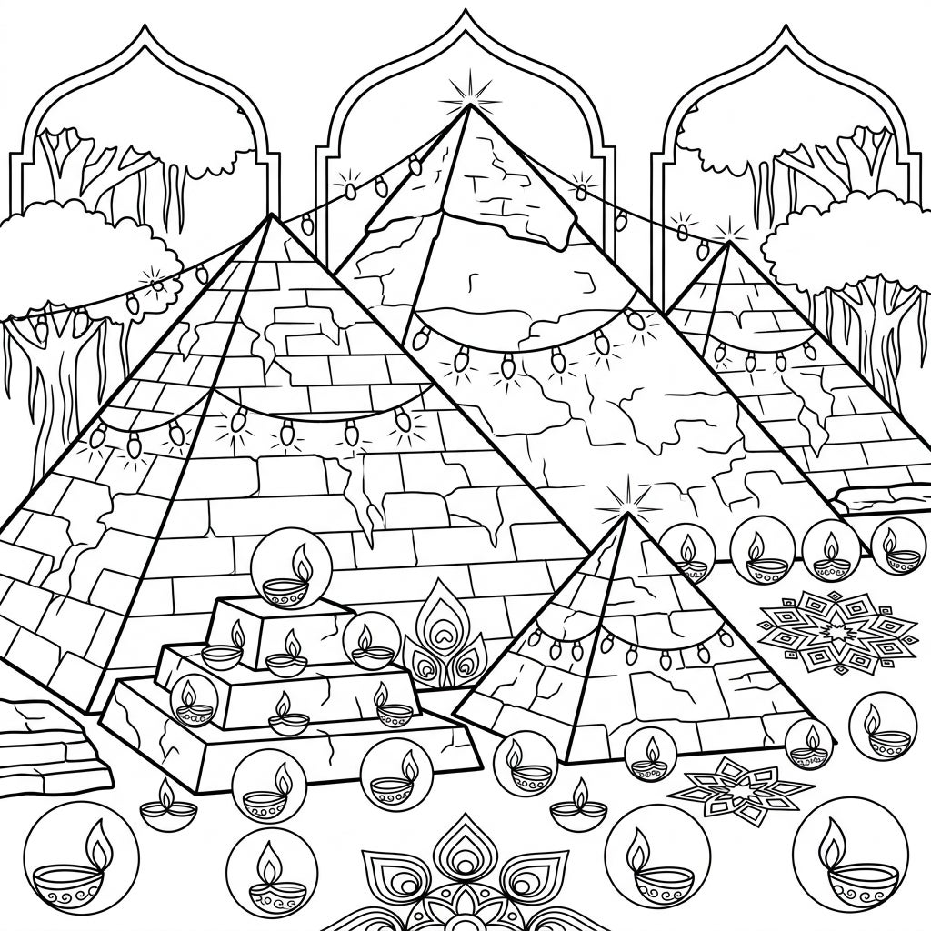 Discover a truly unique coloring experience combining the ancient mystery of pyramids with the joyful celebration of Diwali. This mature design offers large prints and clear outlines, perfect for seniors seeking a relaxing and engaging activity.