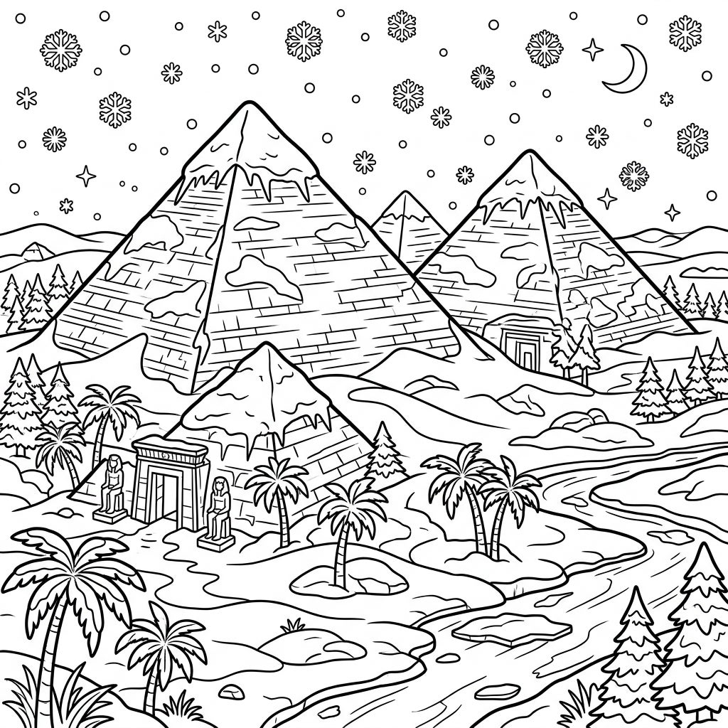 This captivating coloring page transports you to a truly unique setting where the iconic pyramids stand grandly amidst a beautiful winter scene. Each pyramid is artfully depicted with a blanket of freshly fallen snow on its sides and icy formations clinging to its peaks, creating a stunning contrast with the ancient stone. The foreground reveals a tranquil river, its waters dotted with floating ice, winding through a landscape peppered with both snow-dusted pine trees and surprising palm trees, adding an exotic touch to the frosty environment.