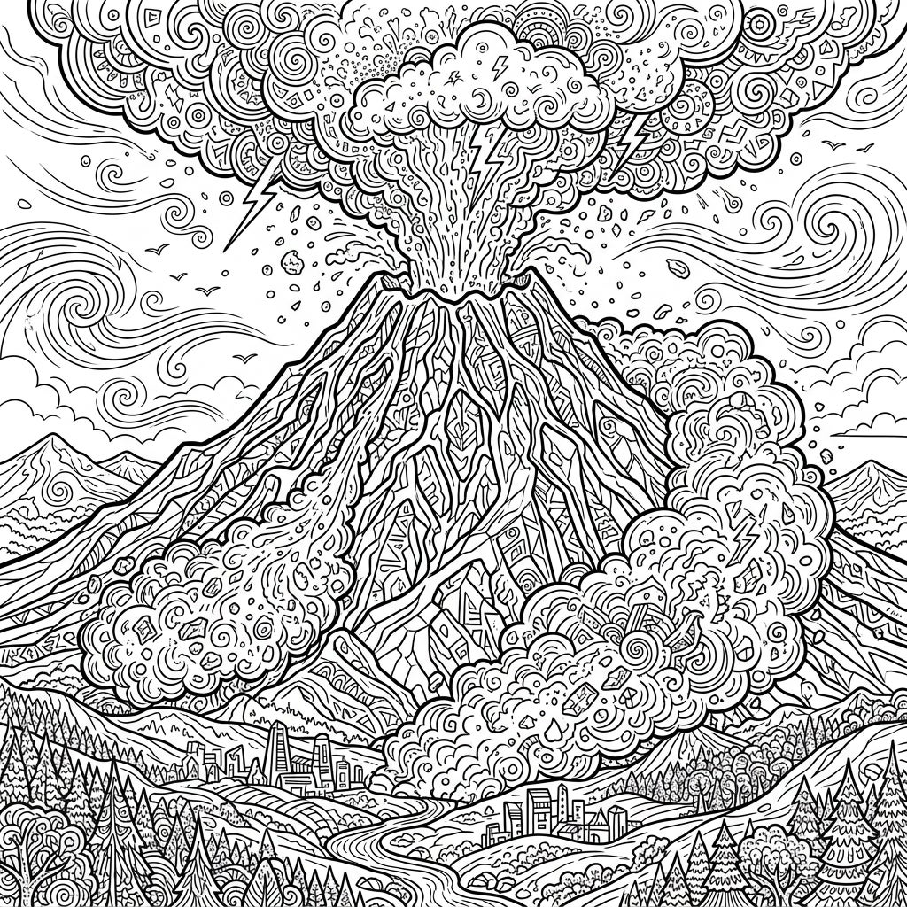 This stunning adult coloring page plunges you into the heart of a breathtaking volcanic eruption. Witness magnificent pyroclastic flows, a torrent of hot gas and volcanic debris, cascading with mesmerizing intricate patterns down the formidable slopes of the volcano. Above, a colossal ash cloud billows, adorned with swirling designs and striking lightning bolts, all meticulously rendered to challenge and delight adult colorists. The detailed landscape unfolds below, showcasing rugged mountains, a dense, textured forest, a meandering river, and a small, resilient city nestled in the distance, providing a rich tapestry of elements to bring to life with your chosen colors.