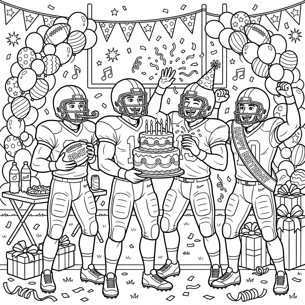 This coloring page perfectly captures the electric energy of a successful team's birthday bash! Imagine the cheers and laughter as these athletic friends gather to celebrate. It's a fantastic blend of sportsmanship and pure birthday joy, making it an ideal activity for kids and adults who love football and festive occasions. The atmosphere is undeniably happy and spirited, inviting you to add your own burst of color to every element, from the players' uniforms to the sparkling party decorations, bringing this touchdown celebration to life.