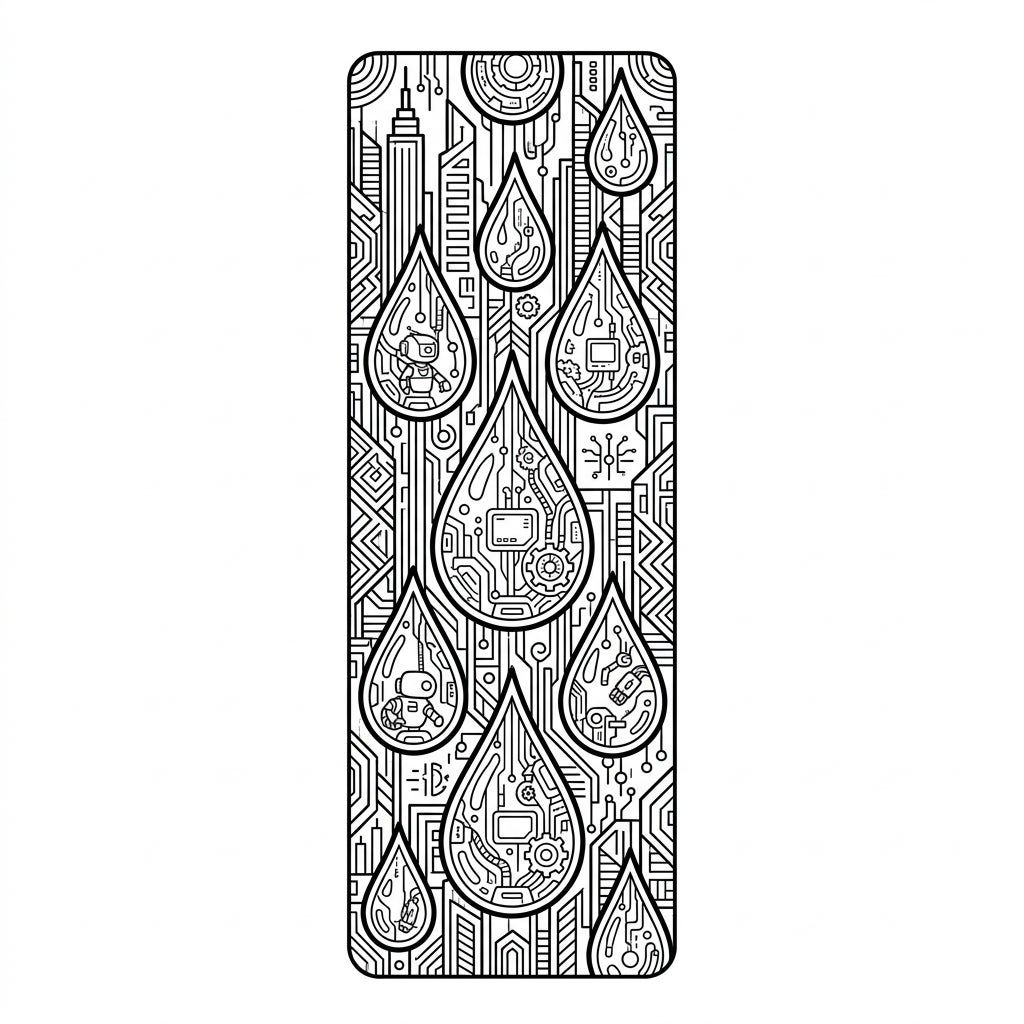 Immerse yourself in a visionary blend of nature and technology with our Cyberpunk Rain Bookmark coloring page. This striking vertical design showcases a cascade of rain droplets, each a marvel of intricate detailing. Inside these unique drops, you'll discover a miniature world of gears, circuit boards, tiny robots, and futuristic displays, all rendered with sharp, clean lines reminiscent of a high-tech blueprint. The background further enhances the theme, featuring complex urban grid patterns and interconnected wires that create a dense, engaging landscape, leaving no space uncolored.