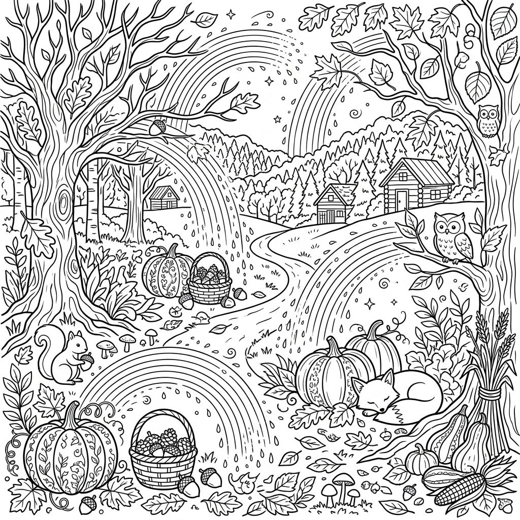 Discover the cozy charm of autumn with this beautiful coloring page, where whimsical rainbow sprays dance over a serene forest landscape. Featuring adorable woodland creatures, harvest bounties, and rustic cabins, it's a perfect fall escape.