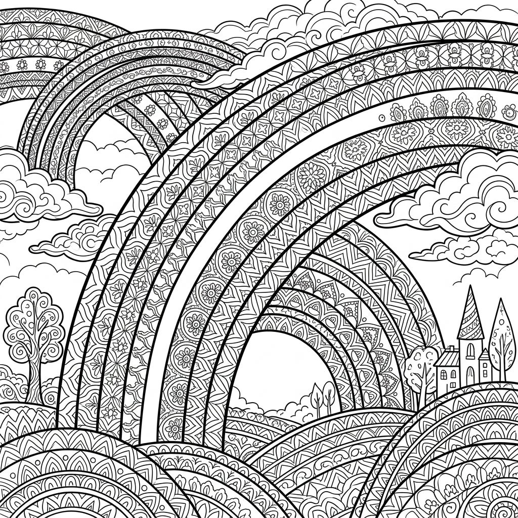 Step into a world of vibrant potential with this stunning adult coloring page, showcasing a majestic array of rainbows arching gracefully across a serene landscape. Each rainbow band is adorned with a rich tapestry of intricate mandala-like patterns, floral motifs, and geometric designs, promising hours of focused artistic engagement. Below the spectacular sky, rolling hills are etched with similar decorative patterns, providing a sense of depth and continuity, dotted with charming, quaint houses and leafy trees nestled amongst fluffy clouds.
