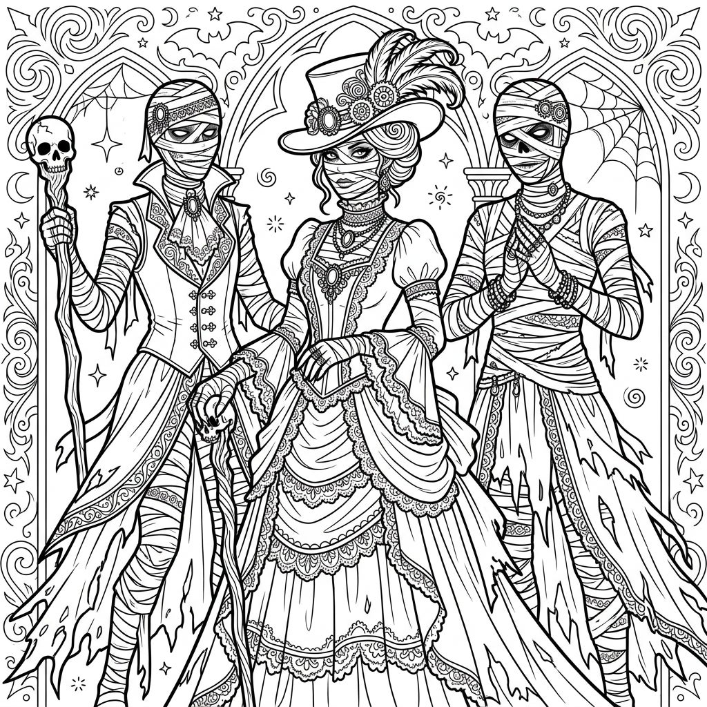 Step into a darkly enchanting world with this captivating coloring page, showcasing three reanimated mummies brought to life with exquisite detail. At the center, a distinguished female mummy commands attention in her elaborate Victorian gown, adorned with layers of delicate lace, ruffles, and intricate jewelry, crowned by a grand feathered hat. Flanking her are two equally impressive mummified figures: one a gentleman in a long, tattered coat holding a skull-topped staff, and the other a graceful lady with clasped hands, draped in elegantly decaying robes. Each character is meticulously wrapped in ancient bandages, revealing glimpses of their supernatural origins.