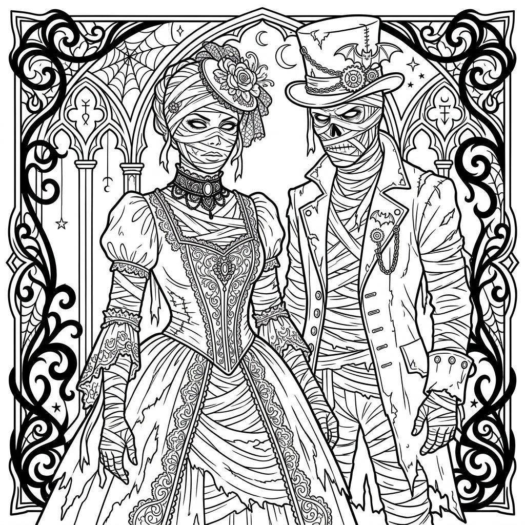 Unleash your creativity with this captivating coloring page featuring a reanimated mummy couple dressed in elaborate Gothic Victorian fashion. Explore intricate details and dark elegance, perfect for a mysteriously delightful coloring session.