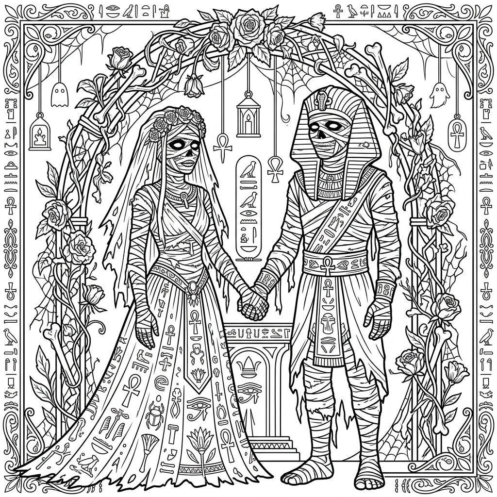 Witness an eternal union with this unique coloring page featuring a reanimated mummy bride and groom. Adorned in macabre wedding attire and surrounded by ancient Egyptian symbols, this design offers a truly otherworldly coloring adventure.