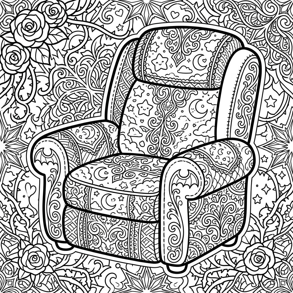 Step into a world where comfort meets enchanting artistry with this one-of-a-kind recliner coloring page. The plush, inviting shape of the recliner is adorned with a captivating fusion of styles. You'll find adorable Kawaii elements like cheerful smiling stars, sleepy moons, and fluffy clouds intricately woven into the fabric alongside sophisticated Gothic swirls, delicate Victorian lace-inspired patterns, and even a subtle bat motif on the armrests. Every curve and cushion invites you to explore a universe of detail.
