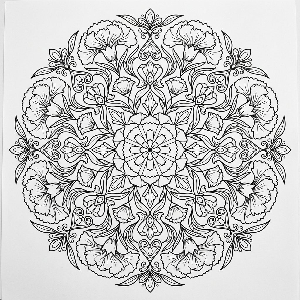 Dive into the exquisite detail of this captivating coloring page, showcasing a perfectly symmetrical radial mandala design. At its heart lies a blossoming central flower, from which intricate patterns of ruffled carnation petals, delicate leaves, and elegant swirling motifs expand outwards. Each segment of the circular pattern echoes the floral theme, offering a rich tapestry of lines and shapes just waiting to be brought to life with your favorite colors. The thick, clean outlines ensure a satisfying coloring experience, guiding your hand through every petal and curve.