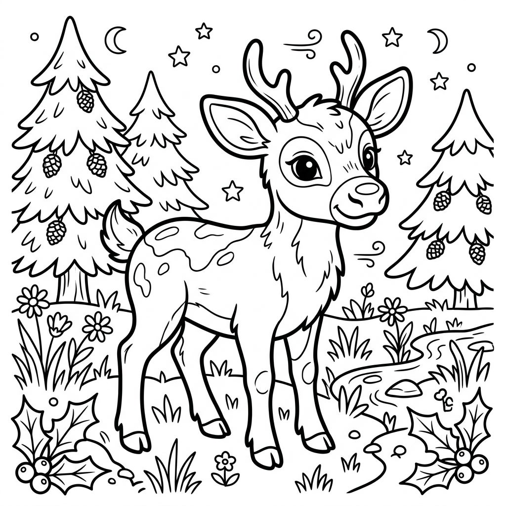 Unleash your child's imagination as they decide on the perfect shades for the reindeer's coat, the deep greens of the pine needles, and the vibrant reds of the holly berries. Will the little fawn have classic brown fur, or perhaps a magical, unique color? Encourage them to experiment with different hues for the sky, stars, and even the winding path, fostering artistic expression and fine motor skills. Download this delightful page and let the colorful adventure begin!
