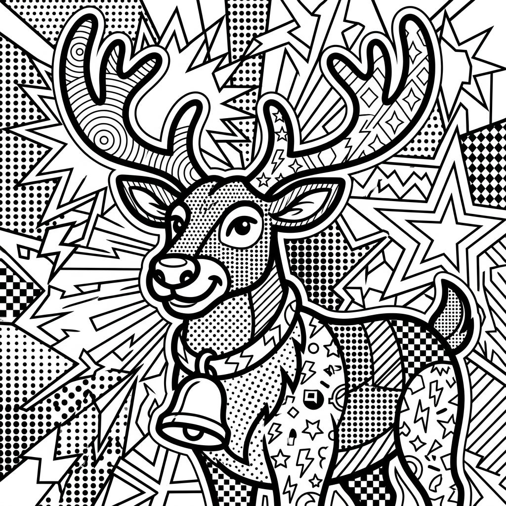 Get ready to bring a burst of color to this charismatic Pop Art reindeer! This full-page illustration features a cheerful reindeer with prominent, ornate antlers and a charming bell collar, all rendered with the distinctive bold outlines of the Pop Art style. Both the reindeer's form and the energetic background are adorned with an array of classic Pop Art patterns, including intricate halftone dots, striking stars, sharp lightning bolts, and eye-catching checkered squares, creating a visually stimulating canvas from corner to corner.