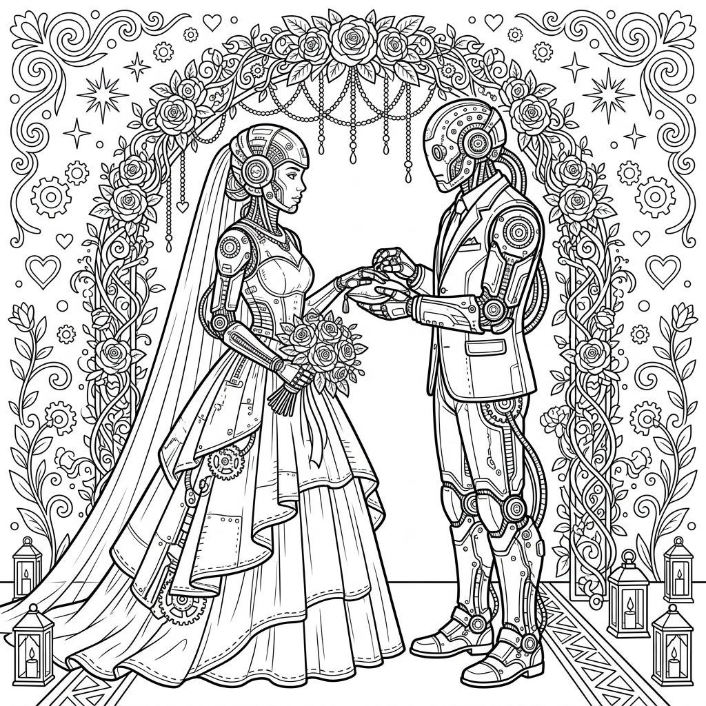 Unleash your creativity as you bring this exceptional union to life with your chosen colors. Consider metallic shades for the cyborgs' intricate parts, contrasting with soft pastels for the bride's gown and vibrant hues for the floral arch. Don't forget the subtle details like the lanterns and background patterns, which offer opportunities for depth and texture, making this a truly immersive and rewarding coloring experience.