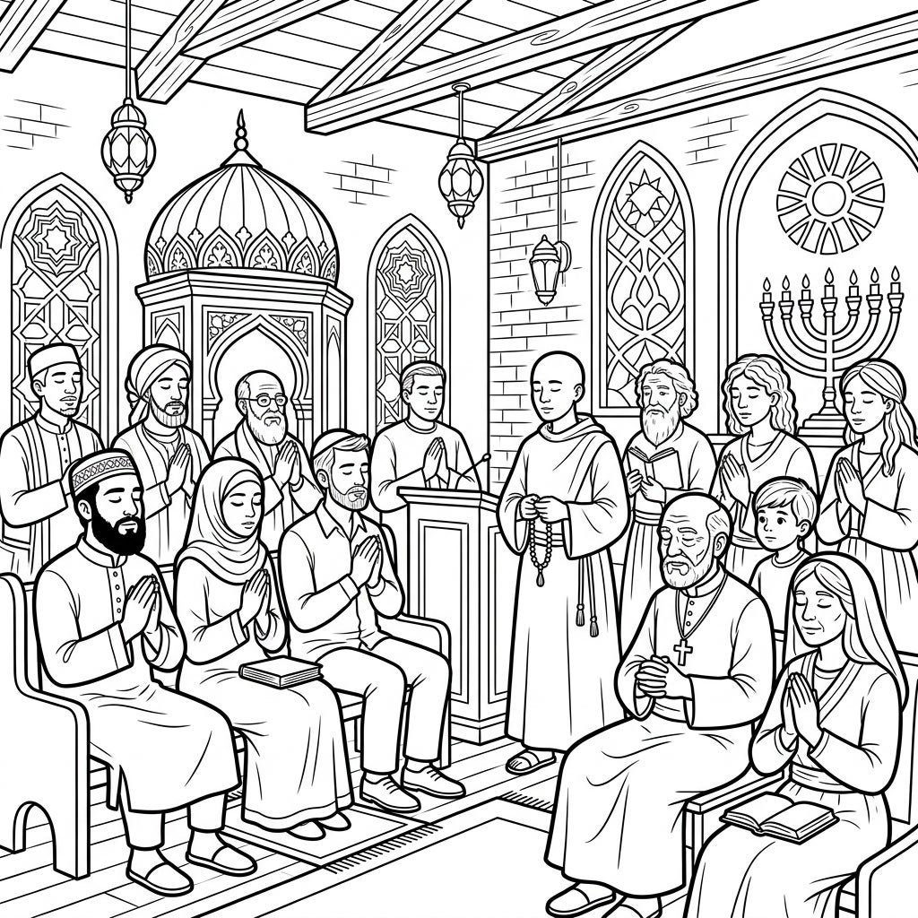 Discover harmony and understanding with this beautiful coloring page featuring a diverse religious gathering. This intricate design invites you to bring a vibrant tableau of shared spirituality to life.
