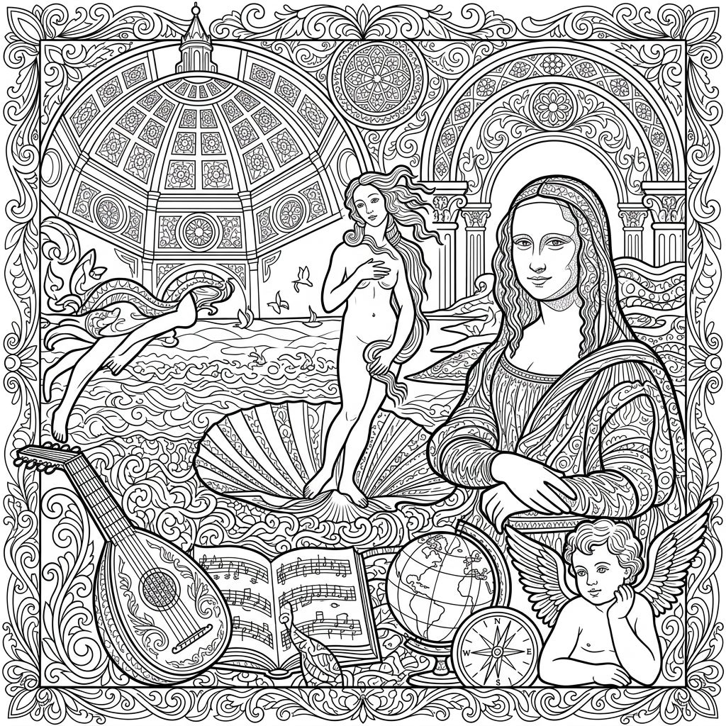 Step into a world where classical art meets contemporary design with this extraordinary coloring page. This intricate Zentangle illustration brings together iconic figures from the Renaissance era. On one side, the enigmatic smile of Leonardo da Vinci's Mona Lisa gazes out, her form beautifully textured with complex Zentangle patterns. On the other, Botticelli's serene Birth of Venus emerges from a seashell, her graceful silhouette and flowing hair adorned with meditative strokes. The background features grand Renaissance architecture, reminiscent of majestic domes and arches, all meticulously detailed with abstract designs.