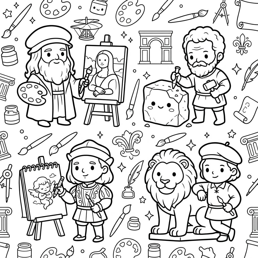 This unique blend of classical art history and modern cuteness creates an engaging and educational coloring adventure for all ages. It's an invitation to explore the genius of the Renaissance through a fresh, fun lens, celebrating creativity and historical milestones with every stroke of your pencil or marker. Immerse yourself in a scene where artistic legends inspire joy and wonder, making learning about art history an absolute delight.