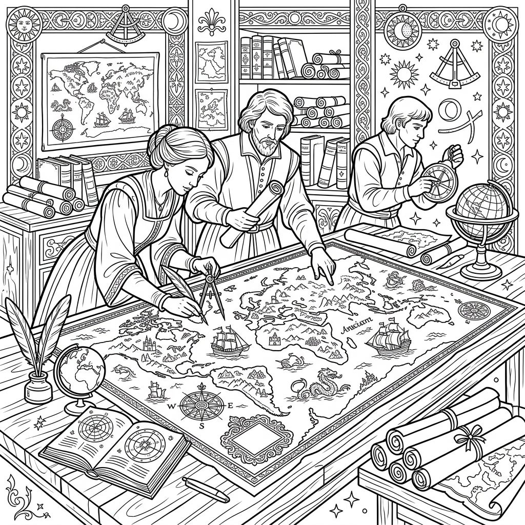 This captivating coloring page transports you to a bustling Renaissance study, where three dedicated cartographers are engrossed in their work. A woman expertly handles a compass and quill, adding fine details to a sprawling ancient world map, while two men scrutinize its features, one pointing to a newly charted area. The meticulously drawn map itself is adorned with sailing ships, mythical sea creatures, and intricate cityscapes, inviting you to explore every geographical nuance.